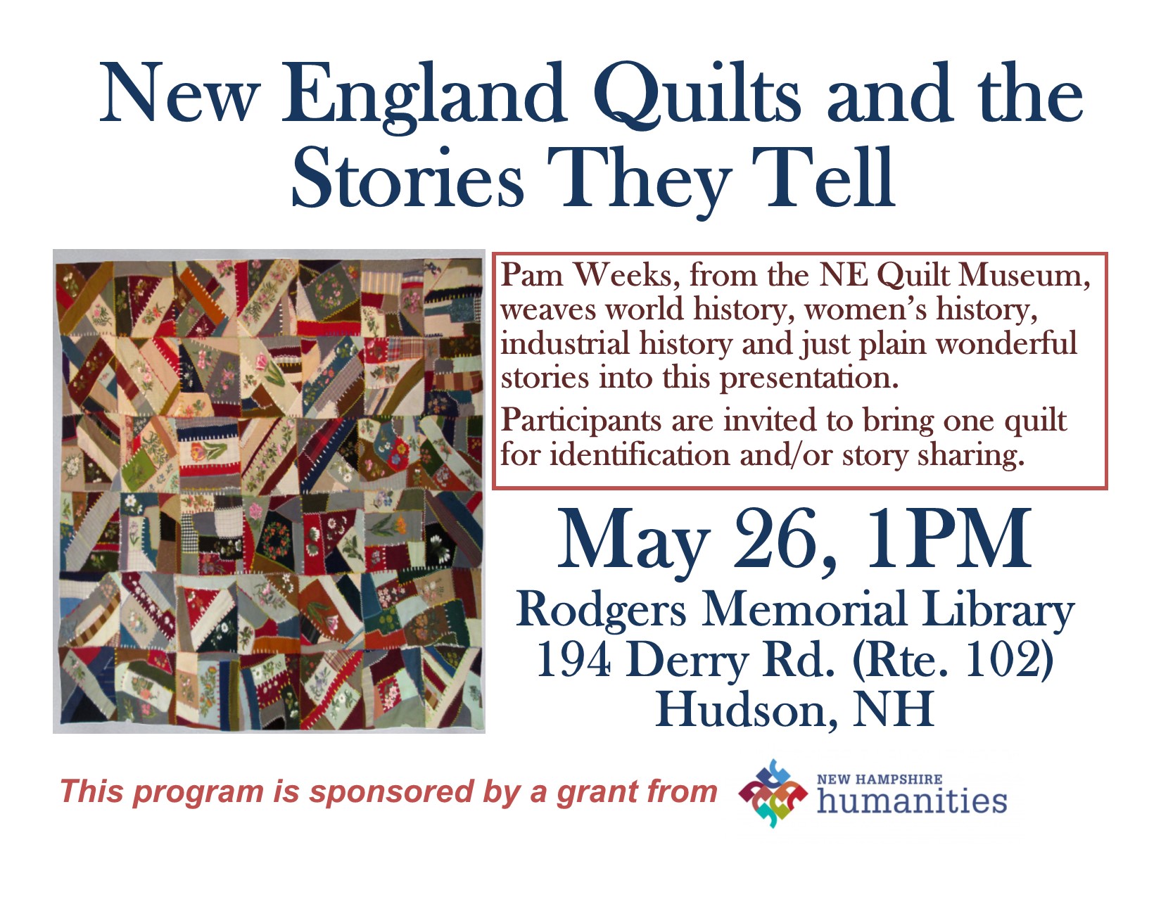 Quilts tell stories, and quilt history is full of myths and misinformation as well as heart-warming tales of service and tradition. Quilting is NOT just an American art; nearly every world culture that has cold weather uses quilted textiles. Pam Weeks, from the NE Quilt Museum, weaves world history, women’s history, industrial history and just plain wonderful stories into her presentation. Participants are invited to bring one quilt for identification and/or story sharing.
