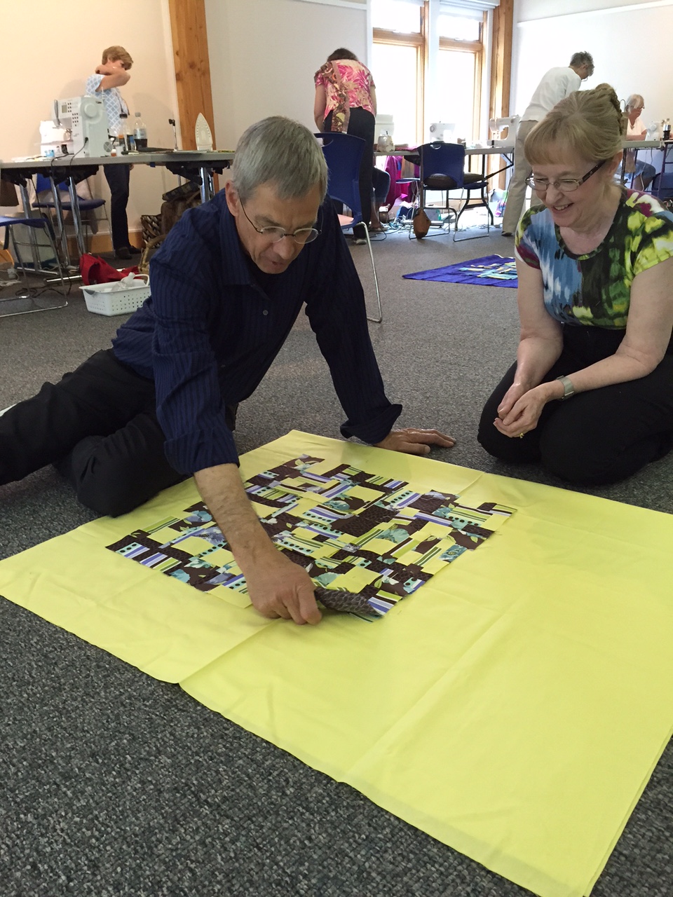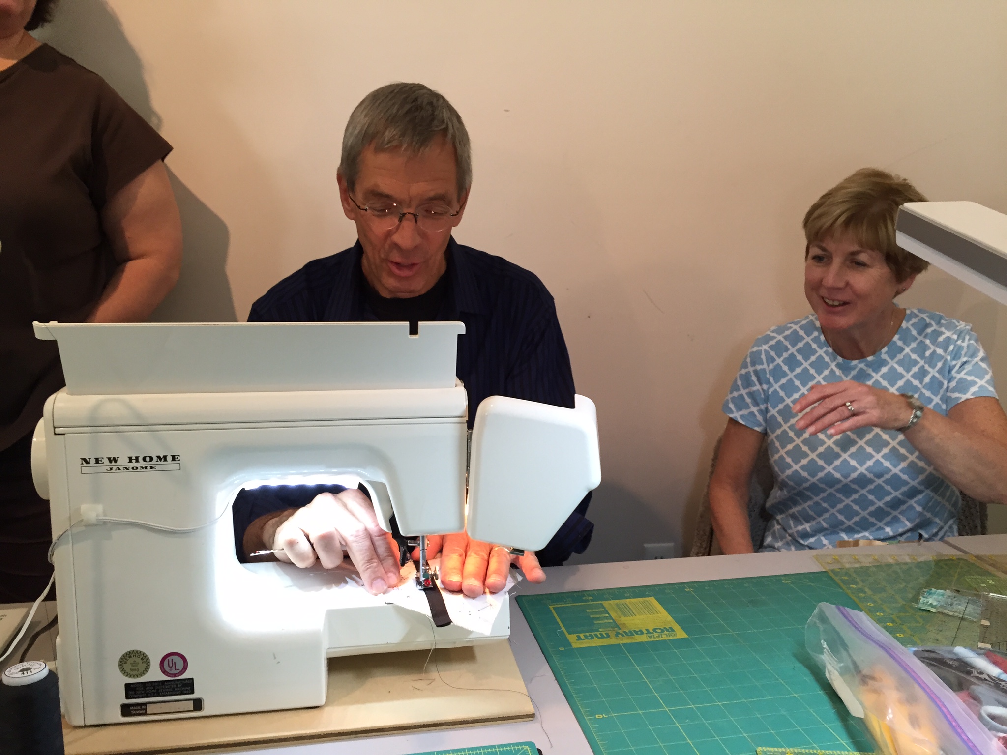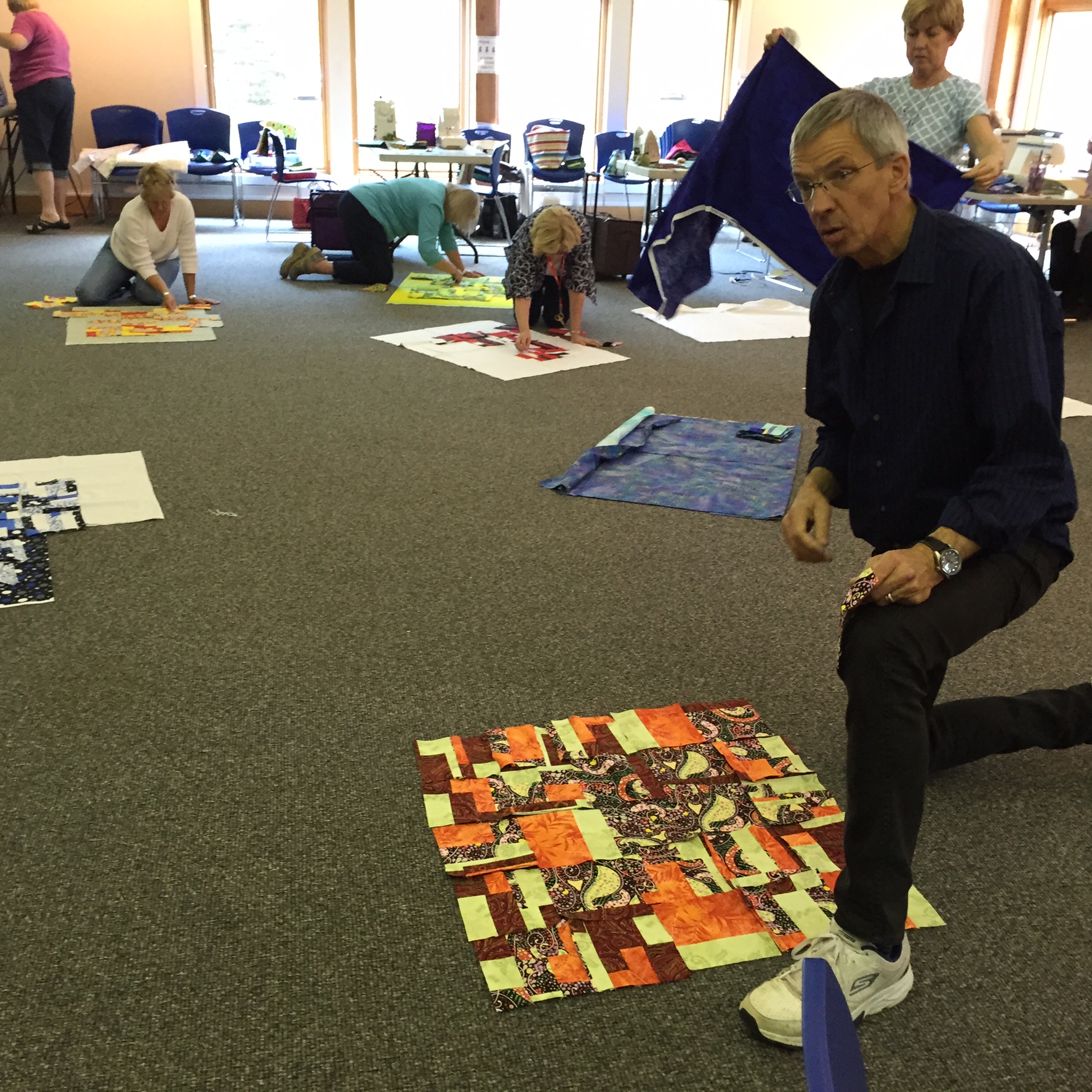 We were totally entertained with Joe Cunningham’s lecture at our recent Guild meeting and I think it is safe to say we all stretched a bit at his workshop and spent a bit of time on the floor. Some of us wrestled with tiny slivers, color choices, following directions, pressing and layout but in the end I think his style of quilt making opened us up to some great possibilities. The workshop was considered a huge success. Shopping with him at PFC and The Barn opened me up to his style of fabric selection & bargain hunting!