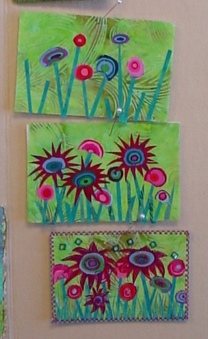 Sarah went over the layering process of constructing your card. She showed an example of the layering process of constructing a design. Once she completes a top she quilts it before she attaches the plain backing. She found it easier to address the postcard when the quilting is not through to the plain back.