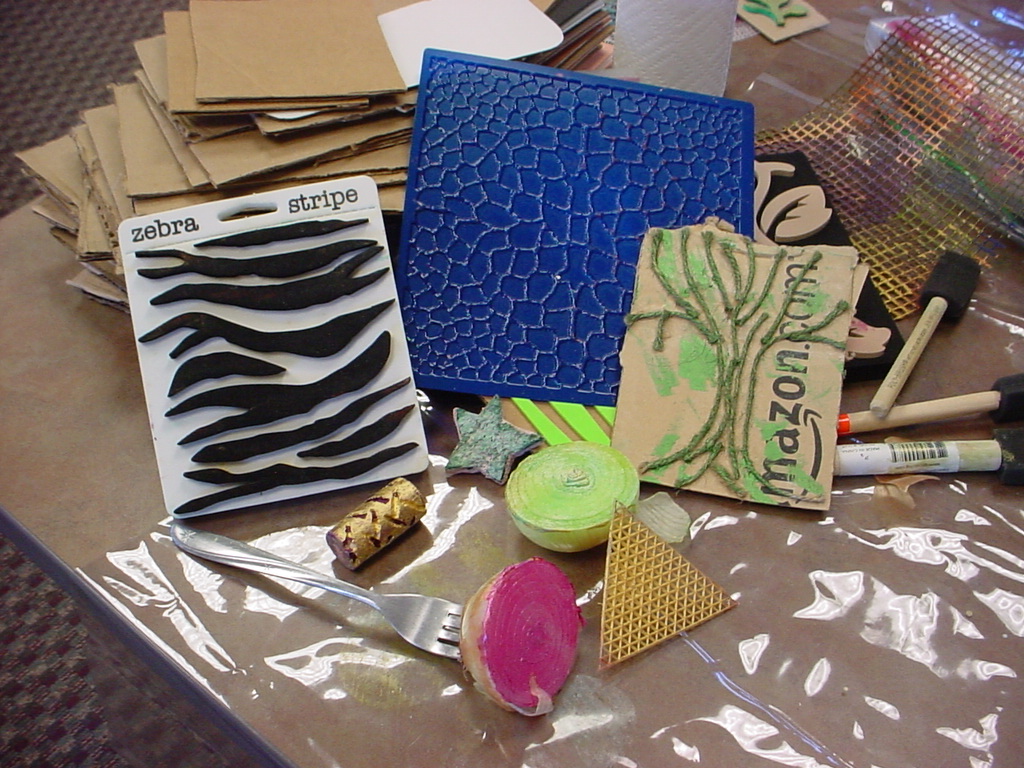 The different ideas for using paints was phenomenal. She demonstrated how to create your own stamps using carving tools and either stamping medium or a simple gum eraser. You can also use automotive gasket making material or craft foam. Another technique was using a surface that has a bumpy design of some kind. Using a roller you could paint the item then use it as a stamp to add texture to a design. She talked about creating your own stamping designs with cardboard and hot glue or twine.