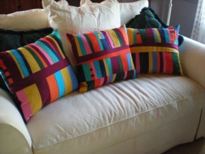 We all know, you can never have enough fabric, so when inspiration struck this summer …I was READY! I attacked those polyester and cotton textiles with a vengeance. I made: 2 personalized “coloring book” tote bags for the great nephews birthdays, they held all of their gifts and goodies; 16 tote bags to hold personal care items for a battered woman’s shelter (a few great accent fabrics added more pizzazz); 2 larger tote bags for shopping green instead of choosing “paper or plastic”; 3 – 17″ Nancy Crow style pillows for the cabin of our sail boat, highly washable; 2 ditty bags to hold wallets, keys, cell phones and items we didn’t want to lose overboard; 2 large ditty bags for containing spare oak mast wedges and a collection of miscellaneous engine parts; and 4 “superperson” capes for the same 2 great nephews and their super friends.