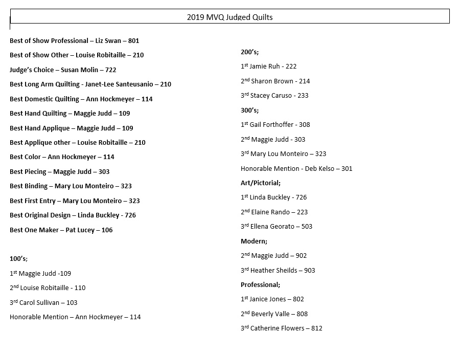 Thank you to the members who submitted quilts to show and to judge. Congratulations to the members who received ribbons. We are lucky to have so many talented quilt makers in our guild.