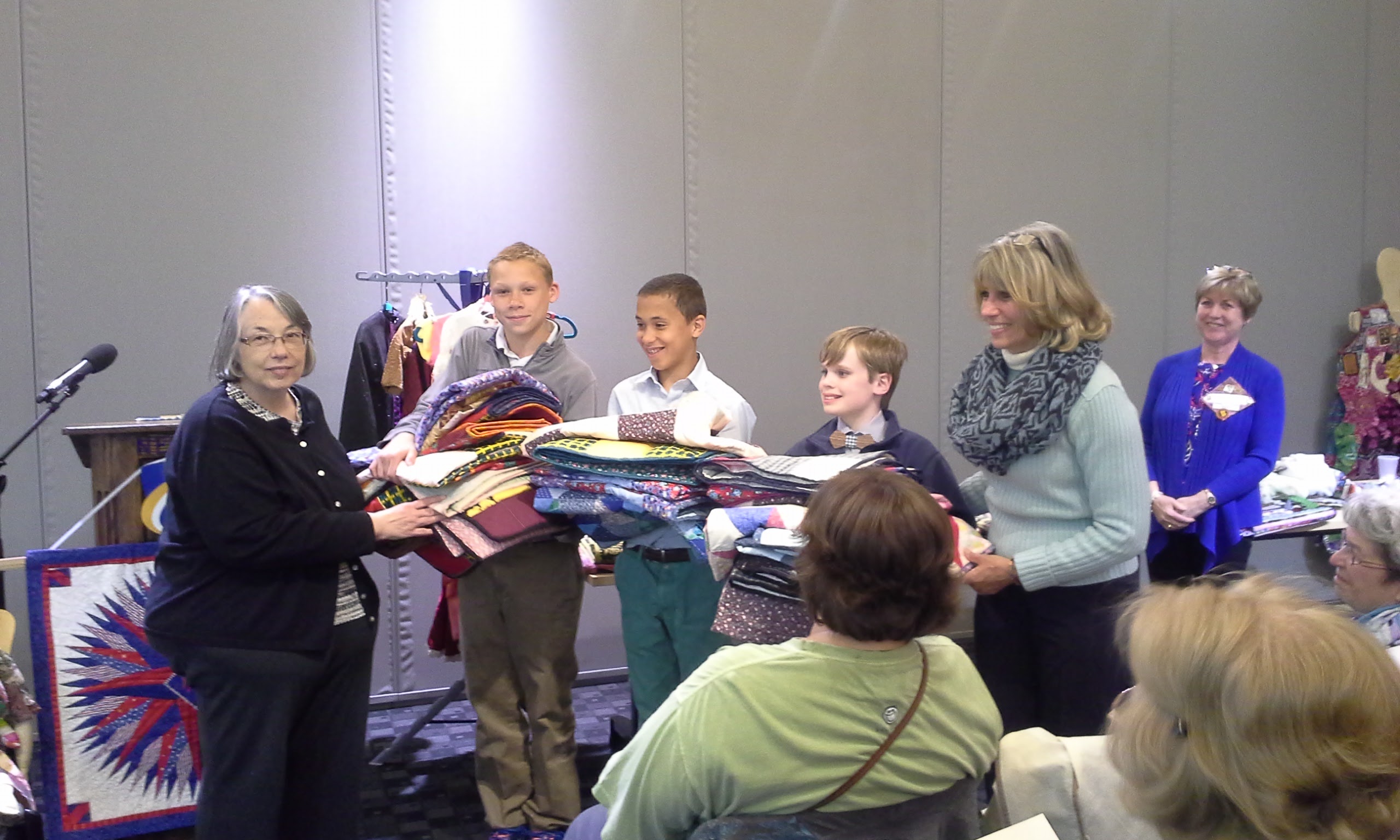 Wrapped in a Hug! Middle School students presented 24 beautiful, handmade quilts and get well cards to the Merrimack Valley Quilt Guild last week. The Guild will donate them to the Quilts for Kids Charity. Delivering the quilts was the culmination of a service project that 43 student and parent volunteers started on the Prep’s Community Day of Service in March. Many thanks to Mrs. Cathy Carroll, who led this wonderful project. Each boy is holding up a quilt that they made.