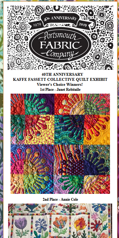 Louise received 1st place Viewers Choice Award for her quilt she entered in the Portsmouth Fabric Company’s 40th Anniversary Kaffe Fassett Collective Quit Exhibit.