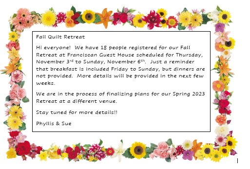 Please make sure that you have signed up for your 2-hour volunteer commitment at the MVQ 2023 show; that is a requirement for the retreat.